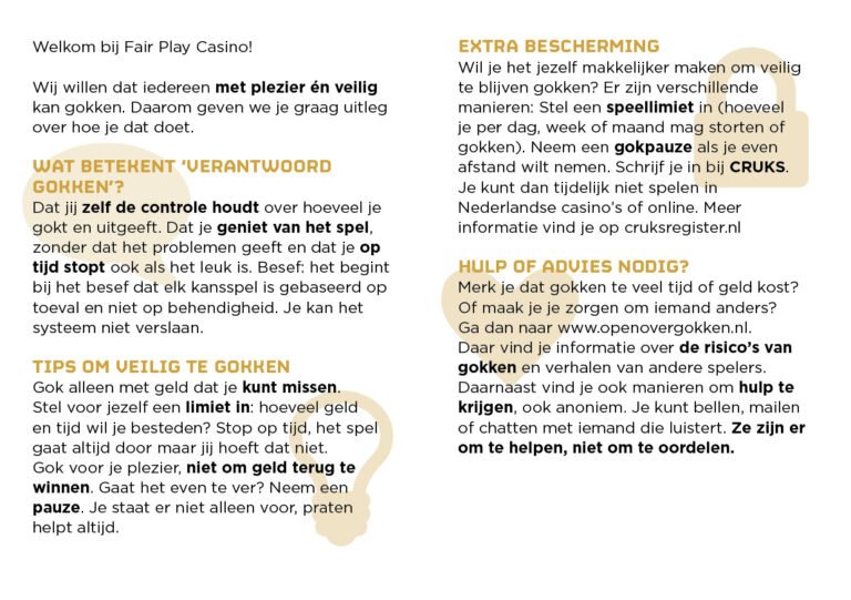 Ons preventiebeleid richt zich in belangrijke mate op voorlichting en bewustwording over spelgedrag. Daarom vinden wij het belangrijk om gasten voldoende hulpmiddelen aan te bieden om verantwoord gokgedrag te bevorderen en informatie te verstrekken ter voorkoming van risicovol speelgedrag. In onze casino’s worden diverse gratis informatiefolders aangeboden, waaronder het goklimietenkaartje (Ken je Limiet!) in verschillende talen (Duits, Engels en Frans), als hulpmiddel voor gasten en als gokken uit de hand dreigt te lopen.